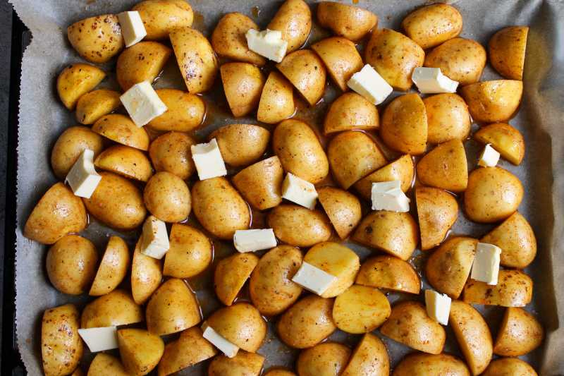 4. Potom ich premiestnite na plech prekrytý papierom na pečenie (plochou časťou smerom nadol) a poukladajte okolo nich kúsky masla.